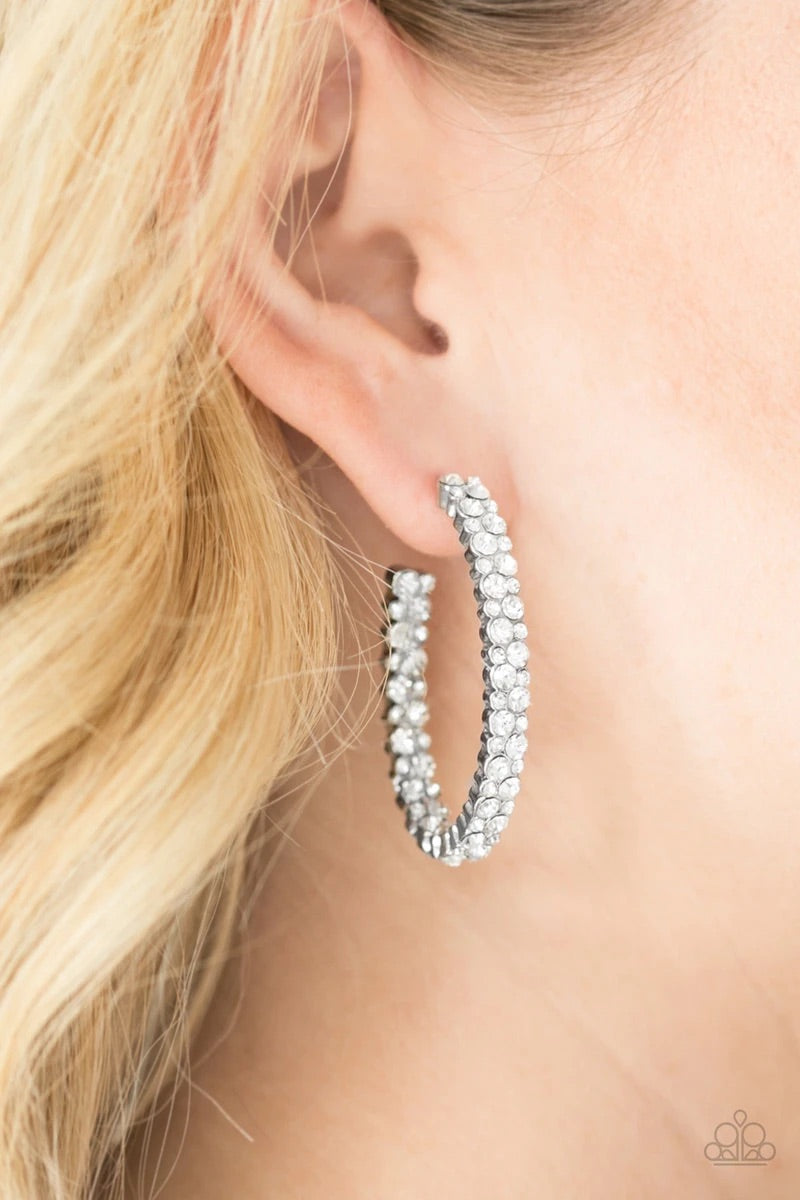 The front of a shimmery silver hoop is encrusted in rows of glassy white rhinestones for a glamorous look. Earring attaches to a standard post fitting. Hoop measures 1” in diameter.