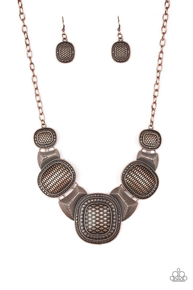 Radiating with geometric and linear details, ornate metal plates link below the collar for a bold tribal look. Features an adjustable clasp closure.