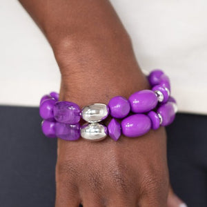 Varying in size and color, fruity purple and shiny silver beads are threaded along stretchy bands around the wrist, creating colorful layers.